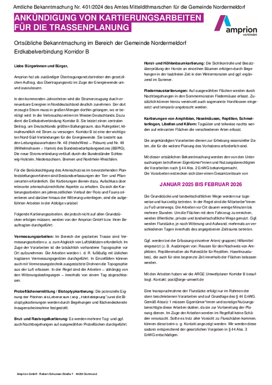 Amprion GmbH: Ankündigung von Kartierungsarbeiten für die Trassenplanung - Ortsübliche Bekanntmachung im Bereich der Gemeinde Nordermeldorf - Erdkabelverbindung Korridor B