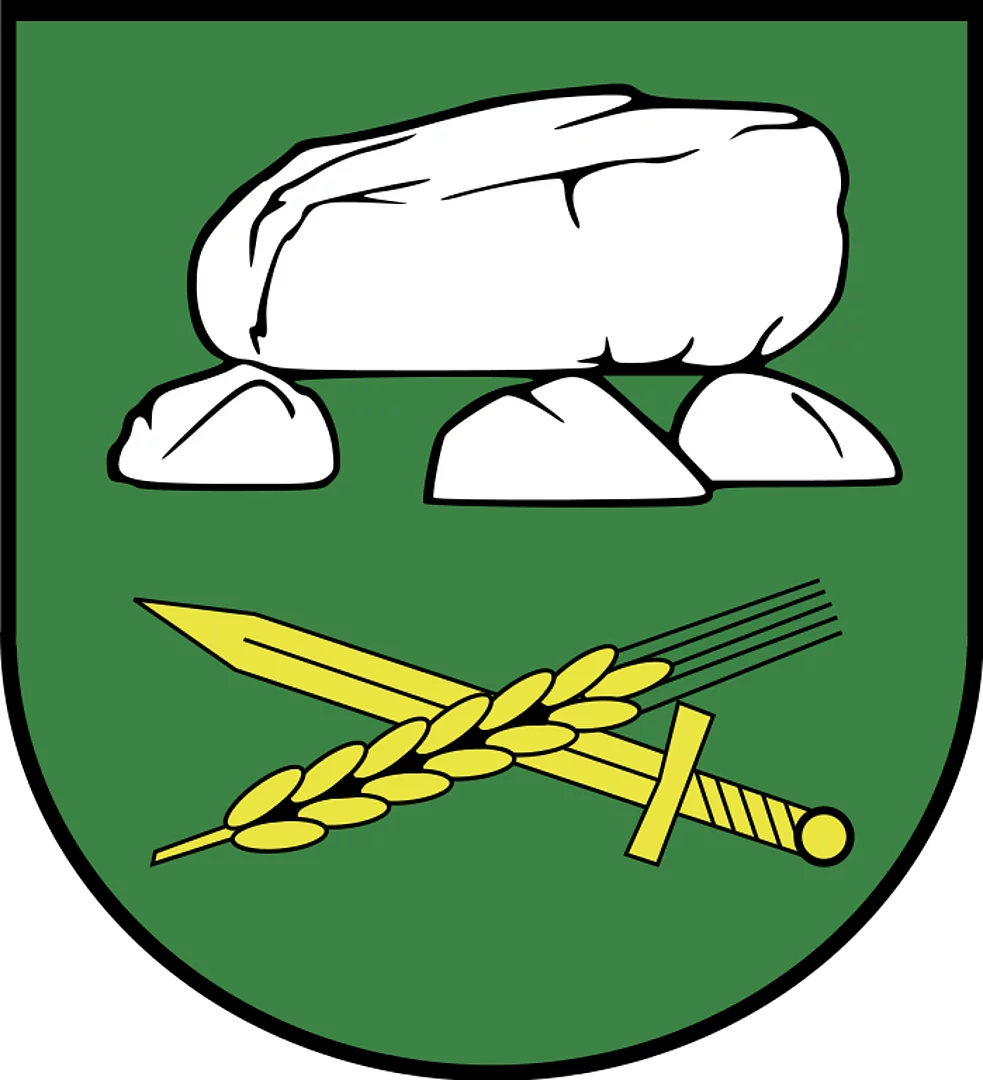 In Grün unter einem aus drei Tragsteinen und einer Deckplatte bestehenden silbernen Steingrab schräg gekreuzt eine goldene Ähre und ein aufrechtes goldenes Schwert.